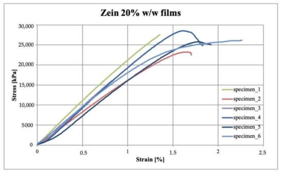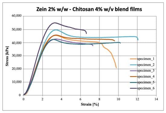 The stress-strain curves obtained from the tensile test carried out on the six specimens per sample, are reported in Figure 4, Figure 5 and Figure 6 for zein, chitosan and blend films, respectively.