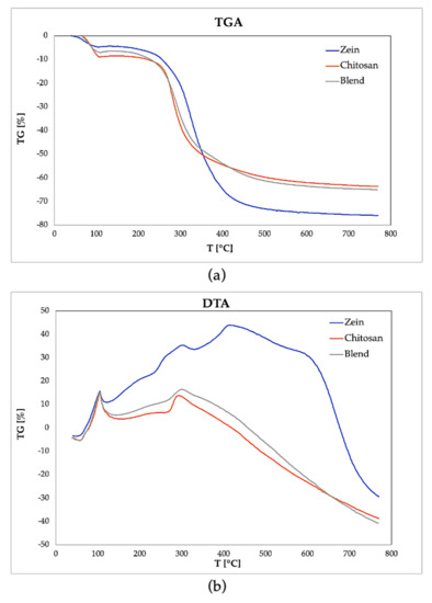 From the graphs, it can be observed that the initial weight loss of the samples due to moisture evaporation equals 4.5% for the zein film, 6.5% for the chitosan film and 8.5% for the blend. The thermal stability of the samples is maintained up to 230 °C, a temperature at which begin to appreciate a loss of weight and an onset of an exothermic peak in the DTA graphs (Figure 7b) due to the chemical degradation of the polymers. This exothermic peak is comparatively more prolonged in the zein, from 240 to 340 °C, while in the other two samples of chitosan and blend. It is appreciable starting from 270 °C. Furthermore, zein shows a second exothermic peak at 420 °C, probably due to the pyrolysis of carbon residues. The total weight loss is 75% for zein, comparable with the literature’s results [6], and 65% for chitosan and blend.