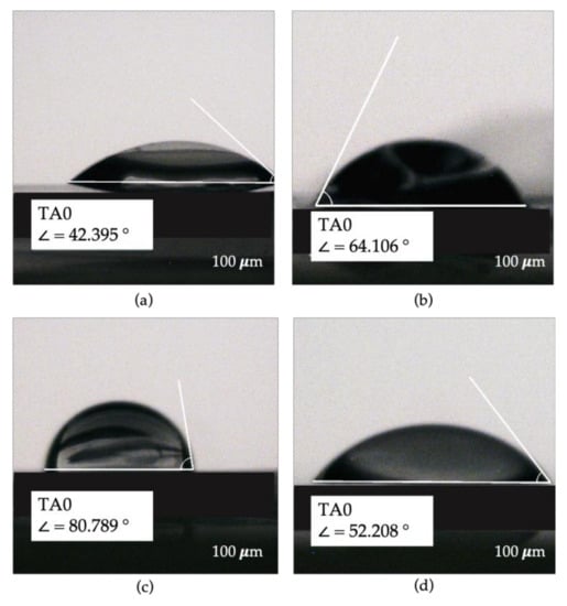 The sessile drop method was used to perform the CA measurement on all the samples produced. The test carried out highlighted a very interesting outcome, as shown in Figure 8, in which some photos of the CA are reported.