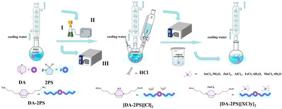Using Lewis acid metal Sn as an example, take 4.31 g (0.01 mol) of intermediate II in a three-necked flask under an atmosphere of N2 and heat at 40 °C to make all of them melt. With magnetic stirring and rapid addition of 7.01 g (0.02 mol) SnCl4·5H2O, warm up to 90 °C and continue magnetic stirring, condensing, and refluxing the reaction for 6 h. After the reaction, the catalyst [DA-2PS][SnCl5]2 was obtained by spin evaporation and vacuum drying at 80 °C for 24 h. Other metal-based functional ionic liquid catalysts were prepared in the same way, and the preparation process is shown in Figure 1.