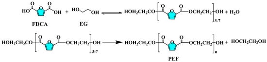 PEF was synthesized by catalyzing the reaction of FDCA with EG using direct esterification method with the five acidic metal-based functional ionic liquids prepared above as catalysts. The synthesis process is shown in Figure 2 in the following steps: