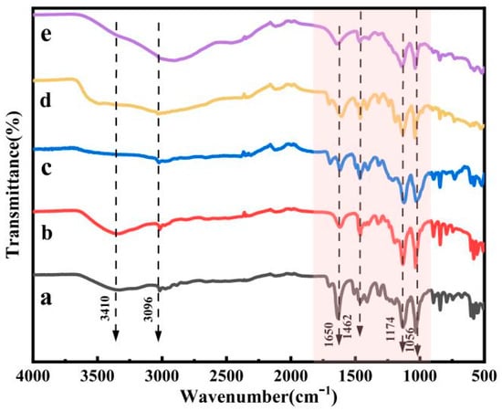 As demonstrated in Figure 3, the absorption peak at 3410 cm−1 corresponds to the O-H stretching vibration peak, while the characteristic peak at 3096 cm−1 represents the antisymmetric stretching vibration peak of C-H. Additionally, the absorption peak at 1462 cm−1 corresponds to the deformation vibration of the C-H bond. The absorption peak at 1174 cm−1 can be attributed to the S=O stretching vibration peak, and the absorption peak at 1056 cm−1 corresponds to the C-N stretching vibration peak. The absorption peak at 1650 cm−1 is due to the presence of water in the preparation of the ionic liquid. Therefore, it can be determined from the above preliminary analysis of FT-IR spectra that the preparation of acidic metal-based functional ionic liquid catalysts was successful.