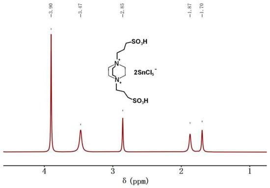 According to Figure 4, it can be observed that the hydrogen atom at a chemical shift of δ = 3.90 ppm corresponds to the hydrogen atom on triethylenediamine. Similarly, the hydrogen atom at δ = 3.47 ppm corresponds to the hydrogen atom in the methylene group adjacent to -SO3− on the chain. The hydrogen atom at δ = 2.85 ppm corresponds to the hydrogen atom in the intermediate methylene group on the chain. Moreover, the hydrogen atoms at δ = 1.87 ppm are associated with the methylene group close to N on the chain. The chemical shift at δ = 1.70 ppm was the peak of active hydrogen in the sulfonic acid group. It can be ultimately confirmed that acidic metal-based functional ionic liquid catalysts were prepared successfully. In addition, the analysis of the 1H NMR and FT-IR spectrum shows that the addition of SnCl4 does not change the structure of the ionic liquid, but only the ionic liquid cationic group complexes with the metal ions.