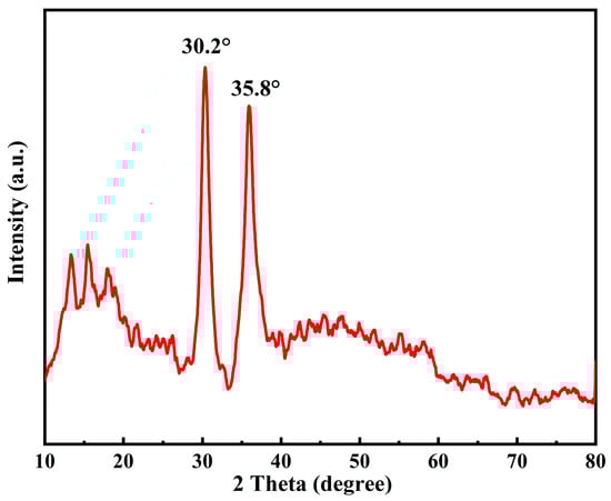 It can be seen from Figure 5 that [DA-2PS][SnCl5]2 showed the diffraction peaks of metal Sn at 2θ = 30.2° and 35.8°. There were no other crystal structures in [DA-2PS][SnCl5]2, so there were no other significant characteristic diffraction peaks. This also indicated that there was no structural failure in [DA-2PS][SnCl5]2. Therefore, the preparation of acidic metal-based functional ionic liquid catalysts was successful.