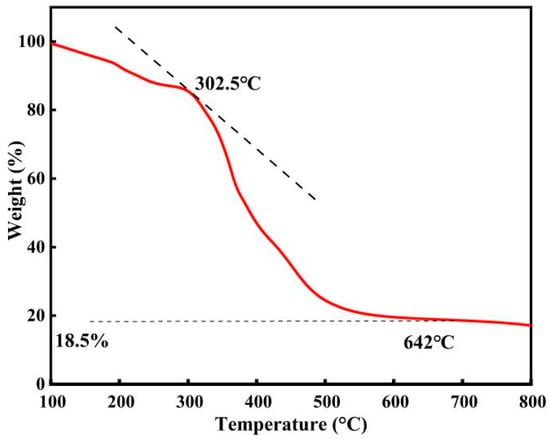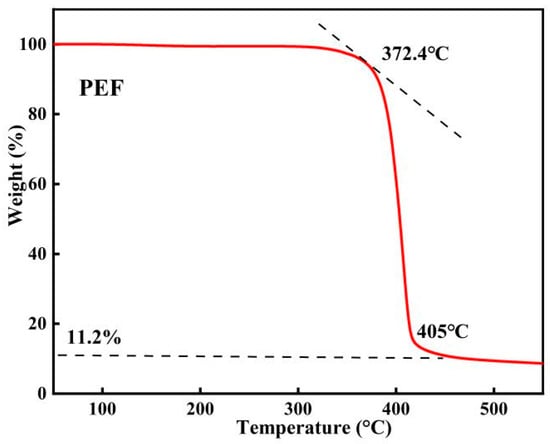 From the TG curve in Figure 12, it is evident that the thermal weight loss process of polymer PEF can be categorized into three stages. In the first stage (from room temperature to 372.4 °C), PEF experienced a small mass change. In the second stage (from 372.4 °C to 405 °C), PEF underwent a significant mass loss and began to decompose rapidly. In the third stage (from 405 °C to 520 °C), there was no longer any significant change in the mass of PEF. In this case, the residual mass was about 6.7% of the total mass. In summary, PEF demonstrates high thermal stability and can be processed using standard thermal processing equipment.
