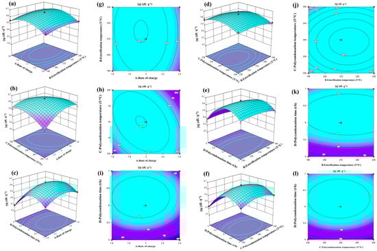 The influence of the four factors, feeding ratio (A), esterification temperature (B), polycondensation temperature (C) and polycondensation time (D), on the intrinsic viscosity of polyester was analyzed using a 3D response surface. The X-axis and Y-axis represented two factors, and six response curves and six contour results were obtained (Figure 9). For example, in Figure 9a,b, it can be observed that the intrinsic viscosity of polyester initially increases and then decreases with an increase in the feeding ratio when the esterification time is constant. Similarly, when the feeding ratio is fixed, the intrinsic viscosity shows a slight increase and then decreases with an increase in the esterification temperature. However, the overall trends are not significant. The curve corresponding to the feeding ratio is steeper than that of the esterification temperature, indicating that the feeding ratio has a greater impact on the intrinsic viscosity of polyester compared to the esterification temperature. The contour plot also suggests that the interaction between the two factors is not significant, which is consistent with the software results. Based on the provided graphs, the order of significance of the four factors on the intrinsic viscosity of polyester is as follows: polycondensation time (D) > feeding ratio (A) > esterification temperature (B) > polycondensation temperature (C).