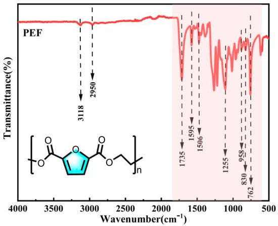 From the analysis of Figure 10, it can be observed that the telescopic vibration peaks of the furan ring C-H occur at 3118 cm−1, -CH2 at 2950 cm−1, C=O at 1735 cm−1, and furan ring C=C at 1595 cm−1 and 1506 cm−1. The peak at 1255 cm−1 corresponds to the C-O-C stretching vibration, while the peaks at 958 cm−1, 830 cm−1 and 762 cm−1 represent the bending vibrations of the furan ring. In conclusion, the infrared spectra of the products were analyzed and compared with the standard PEF infrared spectra in the database. The peak shapes and positions of the characteristic peaks in the products were consistent with the standard PEF spectra, confirming that the polymer products were PEF.