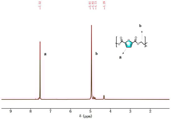 The analysis of Figure 11 reveals several proton peaks in the 1H NMR spectrum of PEF. The proton peak on the furan ring of PEF is observed at δ = 7.52 ppm, while the proton peaks on -OCH2- and -CH2- in the chain segment are observed at δ = 4.95 ppm.