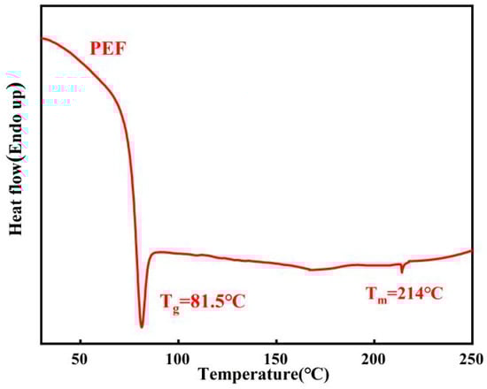 Based on the analysis of Figure 13, it is evident that the synthetic PEF has a Tg (glass transition temperature) of 81.5 °C and a melting point of 214 °C. PEF exhibits a relatively higher Tg and lower Tm. This characteristic enables PEF products to have a higher operating temperature while requiring a lower processing temperature, thereby expanding its potential application areas and reducing processing costs.