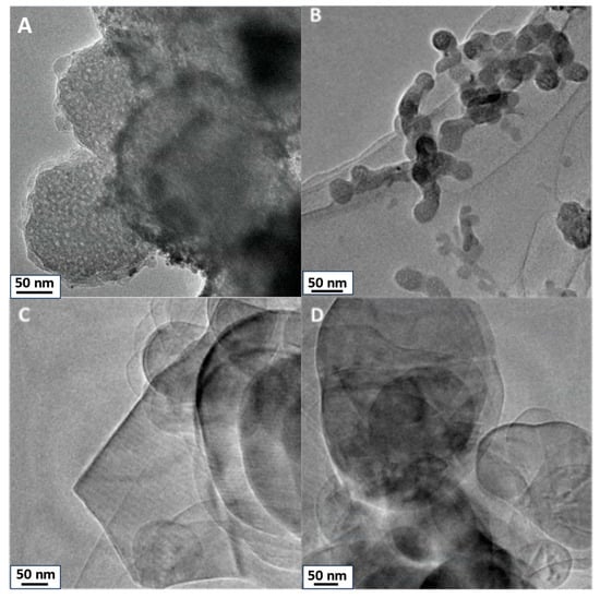 TEM images of SiO2, TiO2, h-BN, and h-BN-OH are presented in Figure 1. SiO2 and TiO2 reveal distinct morphologies. SiO2 (Figure 1A) exhibits particles with spherical morphology, showcasing visible porosity within the silica structure. High porosity directly leads to the high surface area of SiO2. Similarly, TiO2 (Figure 1B) nanoparticles display a spherical or quasi-spherical morphology, relative to SiO2, and exhibit observable porosity with evident pores. For h-BN, the TEM image illustrates a flat and two-dimensional (2D) sheet-like structure. It is a layered material with a hexagonal lattice resembling graphene, showcasing a thin and planar 2D nature. Hydroxylated h-BN (h-BN-OH, Figure 1D) also portrays this 2D planar structure, with the presence of hydroxyl (OH) groups altering surface characteristics but not the fundamental structural morphology.