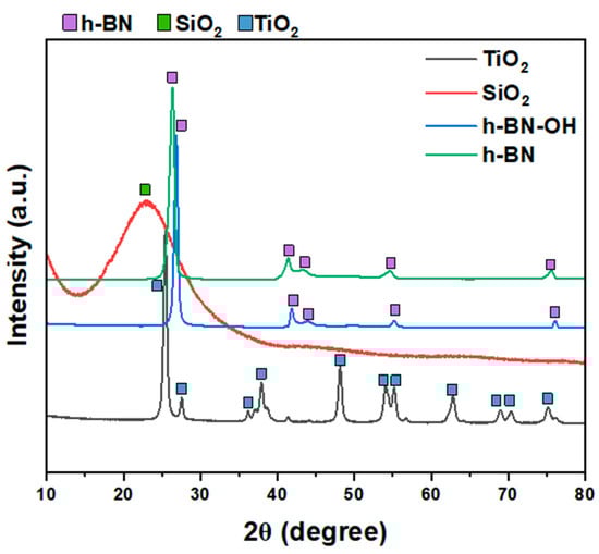 XRD patterns of all crosslinkers (SiO2, TiO2, h-BN, and h-BN-OH) are shown in Figure 2. Both h-BN and h-BN-OH show reflections corresponding to boron nitride (2θ = ~26.7°, 41.6°, 43.7°, 54.9°, 75.6°; ICDD PDF no. 00-034-0421). For h-BN-OH, a clear shift of peaks toward the higher angles is observed in comparison to h-BN. For example, the signal at ~26.39°, corresponding to the (002) plane of h-BN, is shifted to 26.83°. This is due to the expansion of crystallographic structure by the incorporation of the -OH functional groups into the lattice. SiO2 exhibits one broad peak centered at around 23°, which can be assigned to the amorphous structure of silica oxide [17,18]. TiO2 is composed of two crystal phases: anatase (ICDD PDF no. 04-014-8515) and rutile (ICDD PDF no. 00-021-1276). There are ~83.9% of anatase and ~16.1% of rutile in the sample [19].