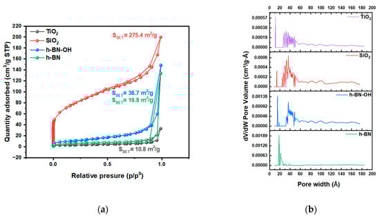 N2 adsorption/desorption isotherms acquired at liquid nitrogen temperature are presented in Figure 3. The isotherms for TiO2, SiO2, h-BN, and h-BN-OH are type II isotherms, where there is a wide range of pore sizes [20]. From TEM, it is clear that pores are present. The highest content is in SiO2, which can result in a high surface area. The highest surface area was determined for the SiO2, which is 275.4 m2/g. h-BN-OH exhibits a larger specific surface area compared to h-BN, which is 38.7 m2/g and 19.8 m2/g, respectively. This is due to the expansion of individual h-BN layers by hydroxyl groups and the creation of a larger surface area that is accessible for N2 adsorption. The lowest specific surface area from all crosslinkers was measured for the TiO2 (10.8 m2/g). A similar dependence can be observed for the total pore volume (Figure 3b). The measured total pore volumes were 0.248, 0.035, 0.011, and 0.008 cm3/g for SiO2, h-BN-OH, h-BN, and TiO2, respectively. Data collected from the N2 adsorption/desorption test are collected in Table 1.