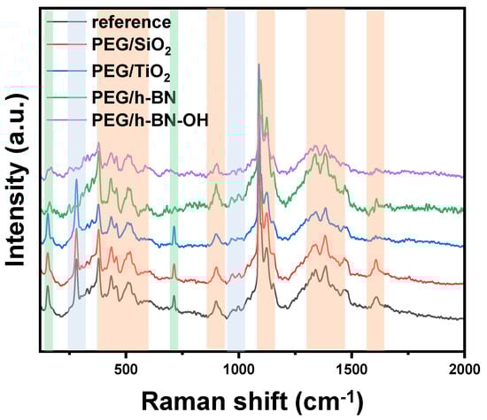 Figure 5 presents the Raman spectra of paper samples (reference, PEG/SiO2, PEG/TiO2, PEG/h-BN, and PEG/h-BN-OH). Cellulose is a linear polymer made up of repeating glucose units linked by β-1,4-glycosidic bonds. It exhibits a high degree of crystallinity, with both crystalline and amorphous regions in its structure. Raman spectroscopy is sensitive to various vibrational modes present in cellulose. The main Raman-active modes for cellulose fibers include C-C and C-O bonds. These vibrations are observed around 1095 cm−1, offering valuable information about the molecular bonds within the cellulose structure [21,22]. Next, out-of-plane ring bending (C-C-C and C-O-C), observed in the range of 400 to 600 cm−1, provides insights into the spatial arrangement and flexibility of the cellulose rings. Additionally, Raman peaks associated with deformations in the CH2 and CH3 groups are prominent in the range of 1300 to 1470 cm−1 [23] (orange zones). Furthermore, Raman spectroscopy studies revealed the distinctive peaks of CaCO3 corresponding to two different forms: calcite (green zones) and vaterite (blue zones). The peak at 1085 cm−1 signifies calcite, while the peaks at 1080 and 1090 cm−1 represent vaterite, specifically corresponding to the Ag internal mode derived from the v1 symmetric stretching mode of the carbonate ion in each material. The v4 in-plane bending mode of carbonate is observed at 712 cm−1 for calcite and 739–749 cm−1 for vaterite. It is noteworthy that the characteristic peak for vaterite was not detected in the case of PEG/h-BN and PEG/hBN-OH. However, the reason of the lack of this peak is not clear.