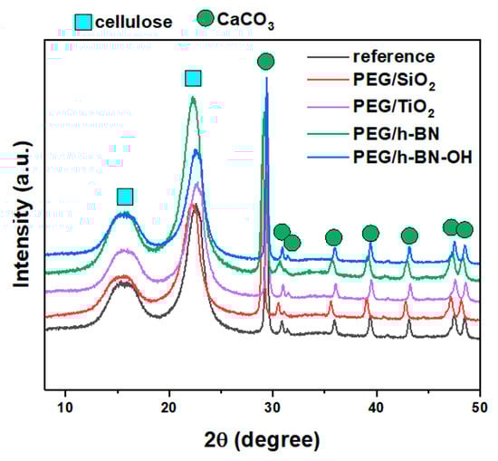 Figure 6 shows the X-ray diffraction patterns of the reference, PEG/SiO2, PEG/TiO2, PEG/h-BN, and PEG/h-BN-OH paper samples. In the patterns of all samples, two characteristic phases were identified, i.e., cellulose and calcium carbonate (CaCO3). The three observed peaks (broad peaks) at 2θ = 16°, 22°, and 35° correspond to cellulose. However, a series of reflections at 2θ equal to ~23°, 29.4°, 36°, 39.4°, 43.2°, 47.5°, and 48.5° are characteristic for CaCO3 (ICDD no. 00-005-2586). The XRD diffractograms also show two peaks (low intensity) at ~30.9° and 31.6°, which can be attributed to other calcium carbonate polymorphs (e.g., aragonite and vaterite) (ICDD no. 01-075-9984, 00-024-0030). The reflections, which correspond to the calcium carbonate, are narrow and intense (compared to the cellulose peaks, the peaks are wider and of lower intensity), which indicates the high crystallinity of the used CaCO3. A lack of a significant effect of the fillers on the intensity and location of individual reflections was found, which may be attributed to the small amount of the additives.