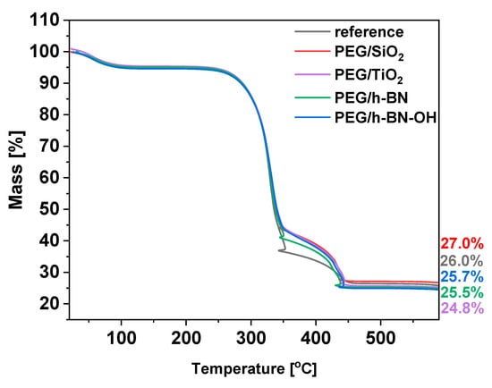 To define the thermal behavior of the paper samples, thermogravimetric analysis (TGA) was applied. The TGA results for the reference and the PEG/SiO2, PEG/TiO2, PEG/h-BN, and PEG/h-BN-OH papers are presented in Figure 7. For all samples, three significant weight decreases are noticeable. First, weight loss is observed at 90 °C and is attributed to the evaporation of the adsorbed water or moisture present in the samples. Furthermore, two stages of cellulose degradation are observed. The first decomposition stage starts at 250 °C. Cellulose consists of glucose molecules linked together by β-1,4-glycosidic bonds [24]. During this stage, glycosidic bonds break, resulting in the release of volatile products and various volatile organic compounds, such as acetic acid and levoglucosan [25,26]. Next, a second decomposition stage starting at 350 °C is observed. During this stage, additional volatile products are formed as cellulose decomposes. Carbon dioxide (CO2) and carbon monoxide (CO) are released at this stage as a result of the breakdown of more complex cellulose structures. Starting with the reference, a gradual mass loss with increasing temperature leads to a residue of approximately 26%, indicating the ash content in the reference sample. In the cases of PEG/SiO2, PEG/TiO2, PEG/h-BN, and PEG/h-BN-OH, the thermal profiles display analogous mass loss curves, resulting in residual masses of about 27.0%, 25.7%, 25.5%, and 24.8%, respectively.