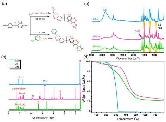 (a) Synthesis of AN and AL, (b) FT-IR spectrum, (c) 1H NMR spectrum, and (d) TGA curve.