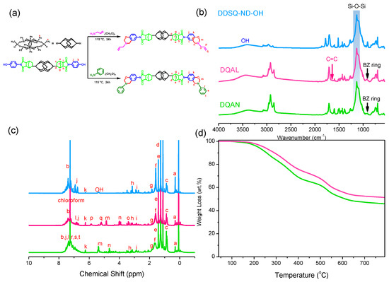 (a) Synthesis of DQAN and DQAL, (b) FT-IR, (c) 1H NMR spectrum, and (d) TGA curve.