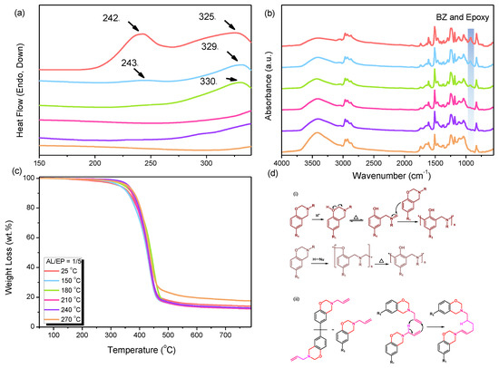 (a) DSC curves of AL/EP = 1/5, measured after heat treatment at room temperature 25 °C and 150, 180, 210, 240, and 270 °C, (b) FT-IR spectrum, (c) TGA curve and (d) (i,ii) presents thermal curing reaction of BZ ring and C=C double bond in BZ resin.