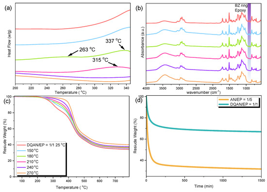 Next, DQAL was mixed with EP in a 1/1 weight ratio to create DQAL/EP = 1/1, and, subsequently, DQAL/EP = 1/1 underwent a series of thermal treatments, ranging from 25 °C to 270 °C, to produce crosslinked materials of DQAL/EP. The DSC analysis results for DQAL/EP = 1/1 during various thermal curing stages are depicted in Figure 6a. When examining the representative orange line, which corresponds to the uncured DQAL/EP sample at 25 °C, it displays similarities to the results obtained for AL/EP = 1/5. Both DQAL/EP and AL/EP samples exhibit two distinct exothermic peaks. The first exothermic peak of DQAL/EP = 1/5 is observed at 230 °C, signifying the heat release from the curing of double bonds (C=C) and the ring-opening polymerization of the EP resin. The second peak, occurring at 326 °C, represents the exothermic reaction resulting from the ring-opening polymerization of the BZ resin within DQAL. During the heat treatment process ranging from 150 °C to 270 °C, the exothermic peak associated with the ring-opening polymerization (ROP) of the oxazine unit in the BZ monomer within DQAL/EP gradually diminishes. This diminishing peak suggests that the ROP process of the oxazine unit has reached completion, indicating a successful and thorough polymerization reaction. The distinctive peak around 923 cm−1 in both the BZ ring and EP diminishes significantly and eventually vanishes entirely following thermal curing, as depicted in Figure 6b. As illustrated in Figure 6c, the values for Td10 and char yield of DQAL/EP exhibit a rise as the level of thermal treatment increases. This phenomenon can be attributed to the development of crosslinking structures originating from the combination of PBZ and EP. The results from the aging test conducted at 380 °C, as depicted in Figure 6d, clearly demonstrated that the DQAL/EP = 1/1 exhibited significantly greater residual mass and superior thermal stability in comparison to the AL/EP = 1/5.