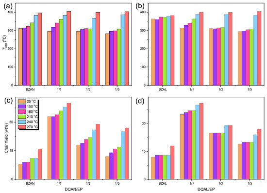 Td10 and char yield of each copolymer at different heat treatment stages (a,c) AN/EP = 1/5 and DQAN/EP = 1/1 to 1/5 and (b,d) AL/EP = 1/5 and AN/EP = 1/5 and (d) DQAL/EP = 1/1 to 1/5.