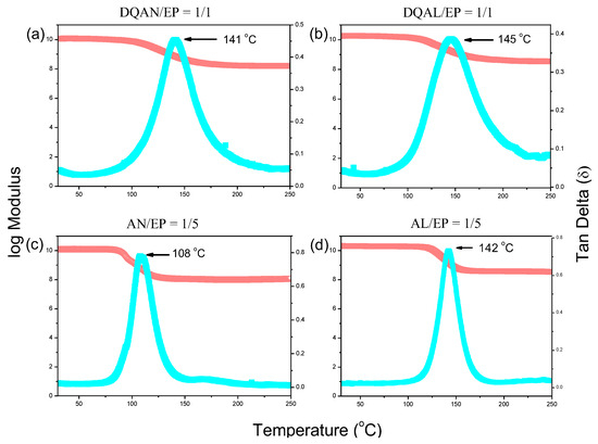 The blend of DDSQ-BZ resin and BPA-BZ resin with a similar molar ratio to epoxy resin (a) DQAN/EP = 1/1, (b) DQAL/EP = 1/1, (c) AN/EP = 1/5 and (d) DQAL/EP = 1/1 to 1/5 AL/EP = 1/5 DMA analysis chart after thermal polymerization.