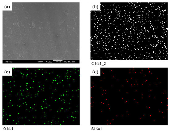 In both images, no distinct phase separation or characteristic morphology was observed, indicating the homogeneous dispersion of BZ resin with inorganic DDSQ nanoparticles during polymerization and the uniform crosslinking with the epoxy resin. Additionally, SEM analysis was used to map the elements C, O, and Si, confirming the atomic distribution and uniform dispersion of BZ resin and epoxy resin in the composition. The mapping results are presented in Figure 9b–d and Figure 10b–d, providing further evidence of the even dispersion of DDSQ particles within the epoxy resin.