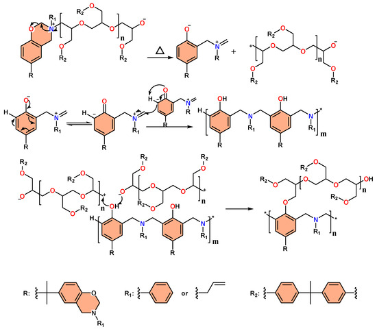 - Krishnasamy, B.; Arumugam, H.; Muthukaruppan, A. Thermal behaviour of benzoxazine blends based on epoxy and cyanate ester. Polym. Compos. 2021, 29, S1475–S1485. [Google Scholar] [CrossRef]