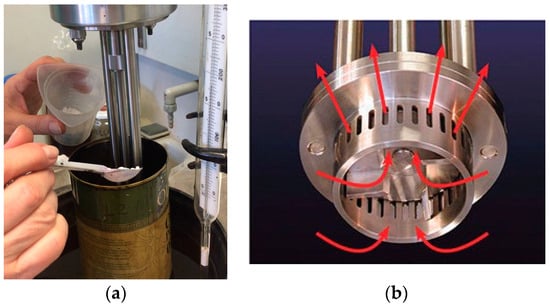 Bitumen modified with crumb rubber: (a) the acquisition process; (b) circulation of the flow during the mixing process (red arrows denote to the bituminous mass circulation pattern during mixing).
