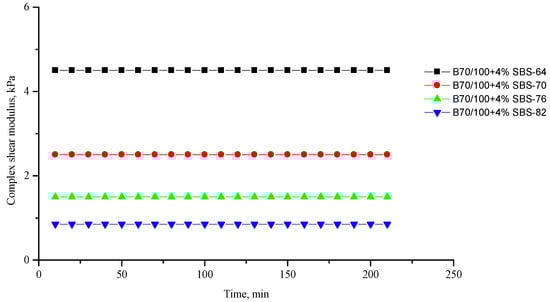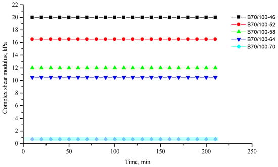 Complex shear modulus G* of the reference SBS-modified (4%) B70/100 bitumen depending on temperature (from +64 to +82 °C) and time.