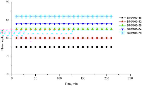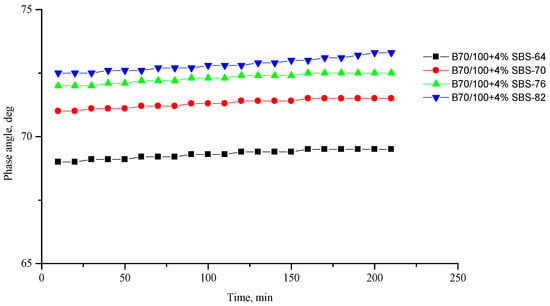 Phase shift angle δ of the reference SBS-modified (4%) B70/100 bitumen depending on temperature (from +64 to +82 °C) and time.