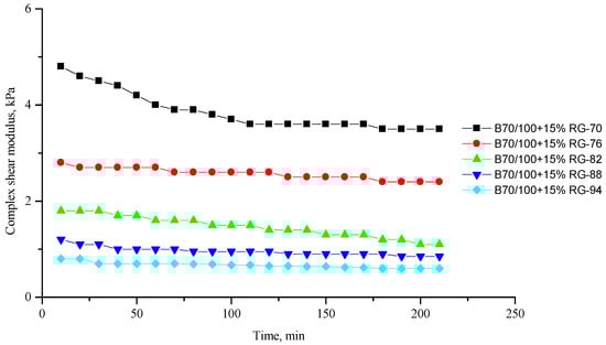 Complex shear modulus G* of the B70/100 bitumen modified with RG crumb rubber (15%), depending on temperature (from +70 to +94 °C) and time.