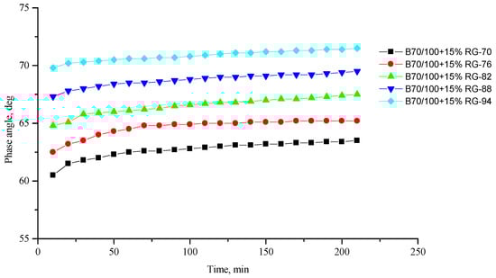 Phase shift angle δ of the B70/100 bitumen modified with RG crumb rubber (15%), depending on temperature (from +70 to +94 °C) and time.