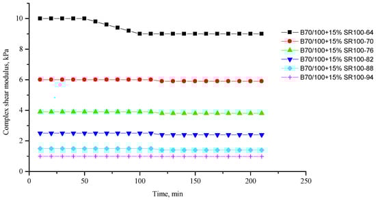 Complex shear modulus G* of the B70/100 bitumen modified with SR100 crumb rubber (15%), depending on temperature (from +64 to +94 °C) and time.