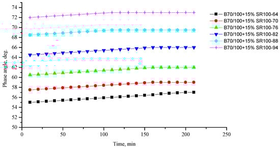 Phase shift angle δ of the B70/100 bitumen modified with SR100 crumb rubber (15%), depending on temperature (from +64 to +94 °C) and time.