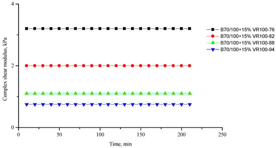 Complex shear modulus G* of the B70/100 bitumen modified with VR100 crumb rubber (15%), depending on temperature (from +76 to +94 °C) and time.