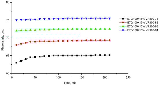 Phase shift angle δ of the B70/100 bitumen modified with VR100 crumb rubber (15%), depending on temperature (from +76 to +94 °C) and time.