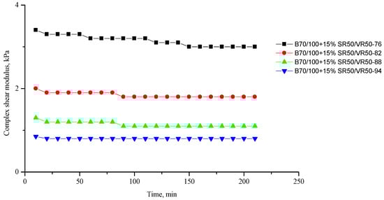 Complex shear modulus G* of the B70/100 bitumen modified with SR50/VR50 crumb rubber (15%), depending on temperature (from +76 to +94 °C) and time.
