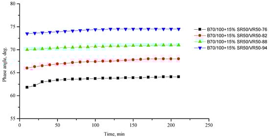 Phase shift angle δ of the B70/100 bitumen modified with SR50/VR50 crumb rubber (15%), depending on temperature (from +76 to +94 °C) and time.
