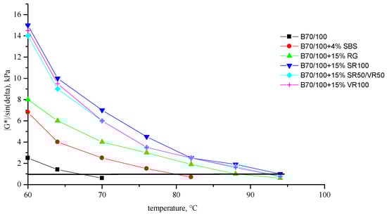 It was shown in [35] that thermal stability can be assessed from the temperature dependence of the dynamic modulus using the methodology proposed in the Superpave standard (United States). According to this standard, the maximum operating temperature of a binder is defined as the temperature at which the G*/sinδ value of the material at an angular strain frequency of 10 s−1 is at least 1 kPa.