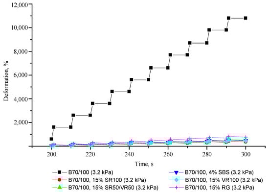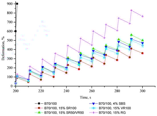 From Figure 15 and Figure 16, it is clear that unmodified bitumen has no elastic properties, i.e., after loading, the bitumen retains its adopted shape without restoring its original state, which is not optimal from the point of view of reducing the formation of cracks. On the other hand, after adding SBS, as well as all the rubber additives obtained from ELTs, the ability of bitumen to elastic regeneration is significantly improved, and, as a result, the resistance of bitumen to cracking is improved. It can be seen that the effectiveness of the rubber additives used is comparable to the effectiveness of SBS in improving the elastic recovery properties of bitumen. Adding truck tire-derived rubber to bitumen can provide even better elastic recovery properties than adding SBS, while the effectiveness of adding a finer rubber fraction is lower. The stronger influence of adding the more coarse rubber particles to the 70/100-grade bitumen may be explained by the larger particles demonstrating better impact absorption characteristics compared to the finely ground rubber powder. Overall, the results show that a rubber-modifying additive’s effectiveness is mainly affected by particle size, while the chemical composition of crumb rubber has a lesser influence.