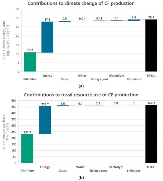 - A scrutinized life cycle inventory (LCI) for the cradle-to-gate production of high-tenacity carbon fibers of average technical quality has been presented, which was approved by an industrial advisory board. The LCI also proved valid against various authors in the literature review. This baseline enables other researchers in the future to model CF production themselves, e.g., for the evaluation of additional impact categories or regional scopes, or for plant-specific assessments.