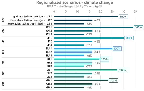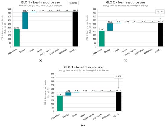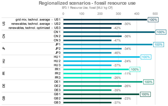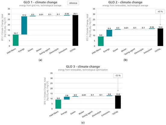 - Lastly, different scenarios have been evaluated to create insights into potential levers for reducing environmental impacts. To this end, the energy source (for PAN fibers and for CF production), as well as a different plant condition (technological average vs. technological optimization) were considered. These variations were applied to the global CF market mix, as well as seven highly relevant supplier countries of CFs. Depending on the scenario and impact category, the environmental impacts of CF production could be reduced by between 11 and 62% at different geographical locations. The deviation between the results and reduction potentials highlights the dependency of the results on the scenario’s specific system boundaries and the investigated setup.