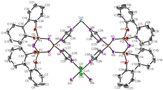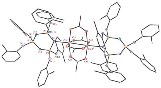 - Hakimi, M.; Rezaei, H.; Moeini, K.; Mardani, Z.; Eigner, V.; Dušek, M. Formation of a copper–copper bond in coordination of a cyclotriphosphazene ligand toward Cu (II): Structural, spectral and docking studies. J. Mol. Struct. 2020, 1207, 127804. [Google Scholar] [CrossRef]