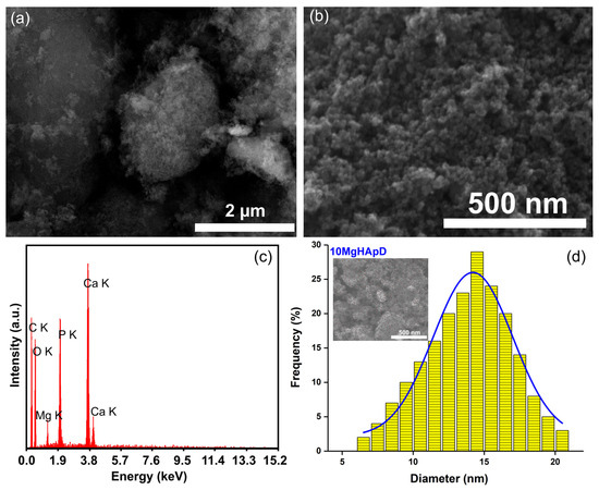 The morphology of the as-synthesized 10MgHApD nanocomposite material is shown in Figure 2. Figure 2a represents the SEM micrograph at low resolution, while Figure 2b shows the SEM micrograph of 10MgHApD nanocomposites at high resolution. The micrograph shown in Figure 2b exhibits nanometric particles with a spherical shape. The average particle size calculated after measuring approximately 500 particles was 14.5 ± 2 nm (Figure 2d). The inset of Figure 2d presents the micrograph on which approximately 500 particles are numbered. Typical EDS patterns establish six prominent peaks which confirm the presence of magnesium, calcium, phosphor, oxygen and carbon, respectively (Figure 2c).