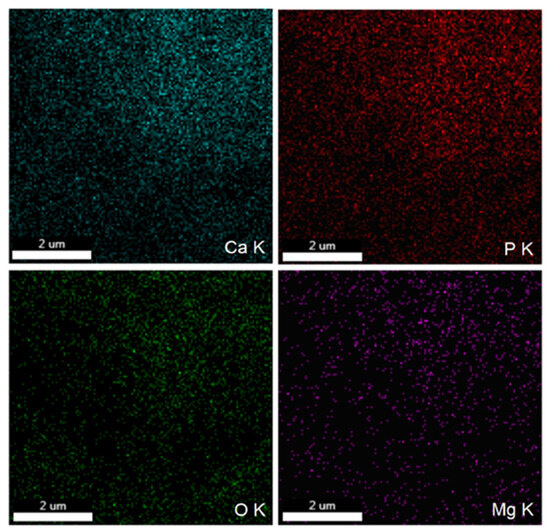 The element map scanning during the EDS analysis was conducted from the region revealed in Figure 2a. The results regarding the element map scanning during the EDS analysis of 10MgHApD nanocomposites are exhibited in Figure 3. The homogenous distribution of constituent elements Ca, P, O and Mg is observed. The C element is not presented because it is not conclusive (the C contribution has two sources, the carbon band and the dextran from the synthesized sample).