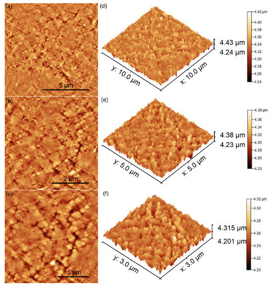 2D AFM images of 10MgHApD pellet’s topography recorded on an area of 10 × 10 µm2 (a), 5 × 5 µm2 (b), 3 × 3 µm2 (c) and their corresponding 3D representations (d–f).