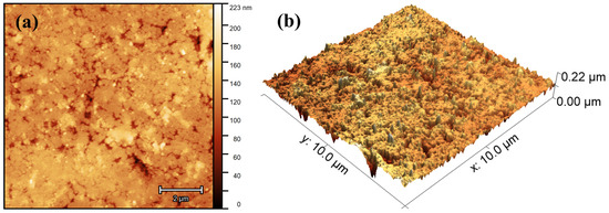 The investigation of coating surfaces using AFM has become a cornerstone for assessing nanoscale topographic changes. With its capability to map both topography and mechanical properties, AFM plays a pivotal role in advancing nanotechnology, characterizing biomaterials, and optimizing devices [37]. In this regard, we assessed the morphology and microtexture of 10MgHApD nanocomposites across various scales. The comprehensive view of the overall morphology of the 10MgHApD pellet’s topography recorded on an area of 10 × 10 µm2 and its 3D spatial configurations is depicted in Figure 5. The 3D topographic map covering dimensions of 10 × 10 µm2 illustrates a relatively smooth surface with certain irregularities formed randomly along the surface following the process of obtaining the pallets. This behavior that appears on the surface of the pellets after the pressing process could be beneficial, contributing to the improvement of the adhesive properties of the surface [45] in order to develop applications in the biomedical field.