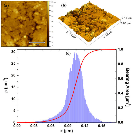 To gain deeper insights into the 3D spatial configuration of the vertical growth profile of the investigated surface, we conducted a detailed analysis of its microtexture. This involved utilizing 3D AFM topographic maps with dimensions of 3 × 3 µm2, as shown in Figure 6a,b. As it can be seen, the pellet surface appears nearly homogeneous and uniform, displaying a finely tuned vertical profile indicative of low topographic roughness. Additionally, the 10MgHApD particles are evenly distributed across the surface, showcasing sizes ranging from 50 to 200 nm. The average roughness (Sa) was computed to be 13 ± 0.2 nm, which is a markedly lower value than other values reported for different coatings, e.g., 980 nm [46] and 47 nm [47]. Such behavior was also observed for the other height ISO-based parameters: maximum peak height (Sp), maximum pit depth (Sv), and maximum height (Sz) (Table 1). Notably, the low roughness of the pellet surface suggests that the incorporation of MgHAp into the dextran matrix has a softening effect on the vertical profile of the investigated surface, with the particles being shaped and embedded by the polymer. Figure 6c shows the shape of the height distribution associated with the vertical profile of the pellet surface and its Abbot Firestone curve [39,48]. As observed, the height distribution of the investigated surface is centralized, a characteristic supported by the kurtosis value Rku ~3, signifying an almost perfectly platykurtic pattern [49]. Furthermore, the distribution is almost symmetric, which is supported by the skewness value Rsk ~0 [50] (Table 1). Additionally, the high quality of the investigated surface is also illustrated by the Abbot Firestone curve, characterized by its typical S shape. In this regard, the curve attains its peak value more rapidly at a specific relative height z value (in µm), providing evidence that the height distribution follows an almost normal behavior.
