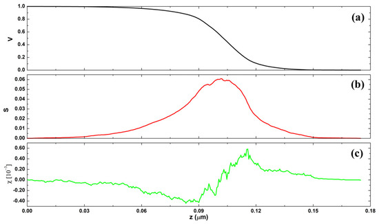 Minkowski Functionals (MFs) serve as geometric measurements employed to characterize and quantify the topological and morphological properties of geometric sets [51,52]. Their primary applications lie in morphological analysis, particularly in contexts such as image analysis and the study of porous materials [37]. The Minkowski volume (V) limit of the investigated surface, as depicted in Figure 7a, exhibits a characteristic S-like shape and approaches its minimum rapidly. This behavior indicates that the volume of material below a threshold is low, confirming the surface’s exceptionally smooth vertical profile. The Boundary Minkowski (S) (Figure 7b) depicts a higher maximum value in 0.06, with a distribution of points similar to a normal curve. This suggests that the surface boundary of the sample is intricate, containing distinctive features in its contour. Finally, the Minkowski connectivity (χ) exhibits a typical minimum negative and a sharp positive maximum value, as shown in Figure 7c. This suggests that the investigated surface has homogeneous surface percolation. This behavior may be associated with a regular distribution of gaps along the pellet surface. Notably, these aspects of the nanocomposite morphology align with the observations made about its morphological and microtextural properties (Figure 6a,b).