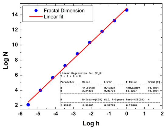 Representative fractal dimension determined using a cube counting method of 10MgHApD nanocomposites, obtained from AFM images shown in Figure 2.